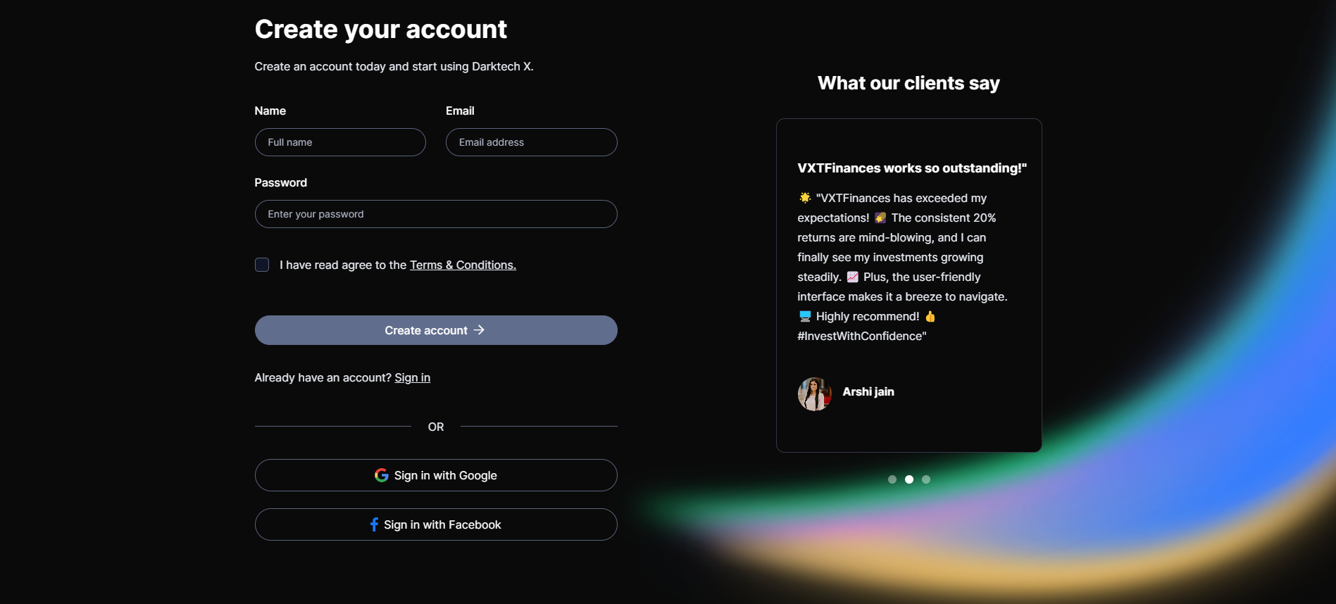 "Click the "Sign Up" button on VXTFinances' website"